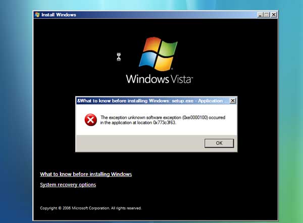 - Mensaje de error mostrando pérdida de un archivo de arranque o un archivo configuración (dll).